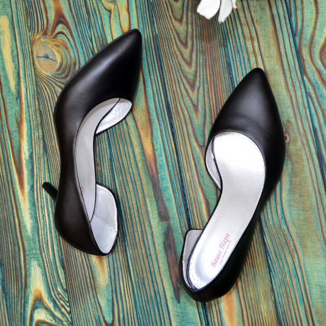 Жіночі туфлі на невисокому шпильці - виконані з натуральної шкіри чорного кольору. Класична модель, з загостреним носком - завжди в моді. Елегантно виглядають на ніжці! Розраховані на стандартну повноту ноги.