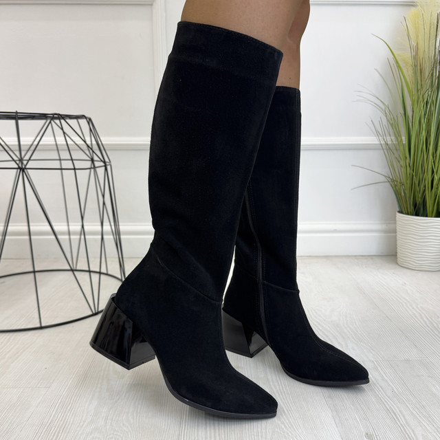 Жіночі чоботи на широкому стійкому підборі. Виготовлені з натуральної замші чорного кольору. Підошва блок, шкарпеточок гострий. Класичне пошиття завжди в моді. Дуже ефектні та стильні. Розраховані на стандартну повноту ноги.