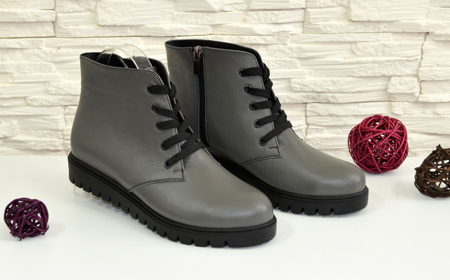Черевики жіночі сірі шкіряні на шнурівці, потовщена підошва