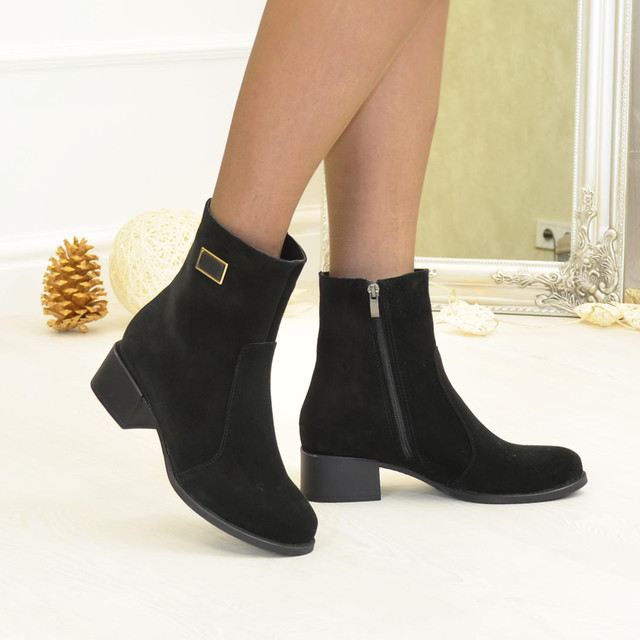 Жіночі черевики, виконані з натуральної замші чорного кольору. Модель пошита в класичному стилі, декоровані фурнітурою. Зручні та стильні, акуратні і комфортні ― ніжка в такому взутті не втомиться. Підошва лита. Розраховані на стандартну повноту ноги.