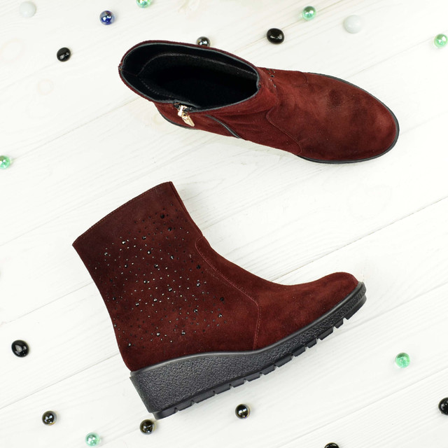 Черевики жіночі бордові замшеві на танкетці, декоровані накаткою каменів