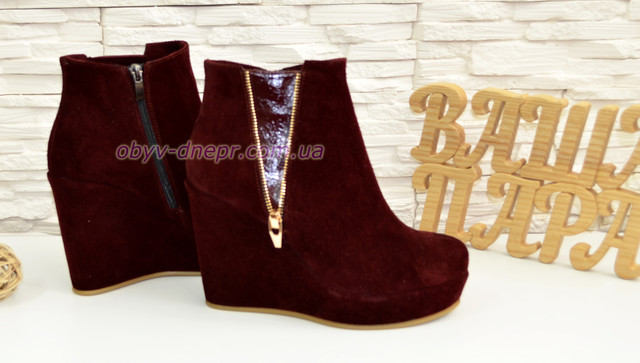 Жіночі черевики виконані з натуральної замші бордового кольору, декоровані вставкою з натуральної шкіри. Модель пошита в класичному стилі на високій стійкої платформи. Стильні та ефектні, добре сидять на ніжці. Підошва лита, міцна. Платформа обтягнута натуральною замшею бордового кольору. Розраховані на стандартну повноту ноги.