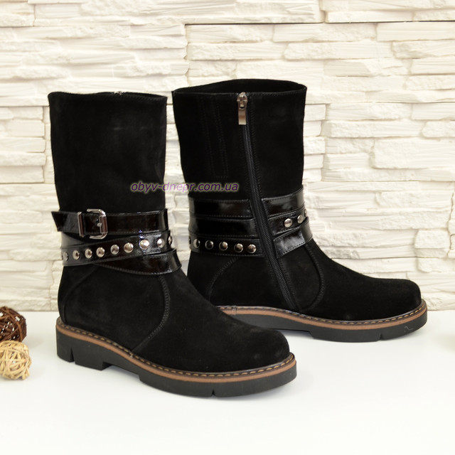 Замшеві черевики жіночі на товстій підошві, декоровані лаковими ремінцями