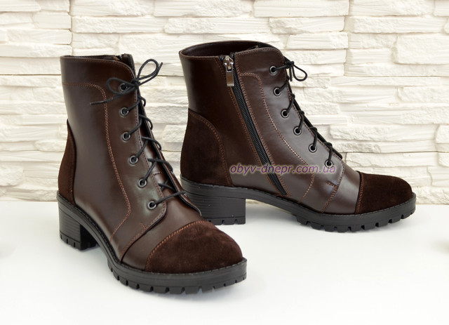 Жіночі черевики, виконані з натуральної шкіри коричневого кольору. Модель пошита в класичному стилі, декоровані вставками з натуральної замші коричневого кольору. Зручні та стильні, акуратні і комфортні ― ніжка в такому взутті не втомиться. Завдяки шнурівці підійдуть на ніжку з підйомом. Для зручності одягання передбачена блискавка. Підошва лита. Розраховані на стандартну повноту ноги.