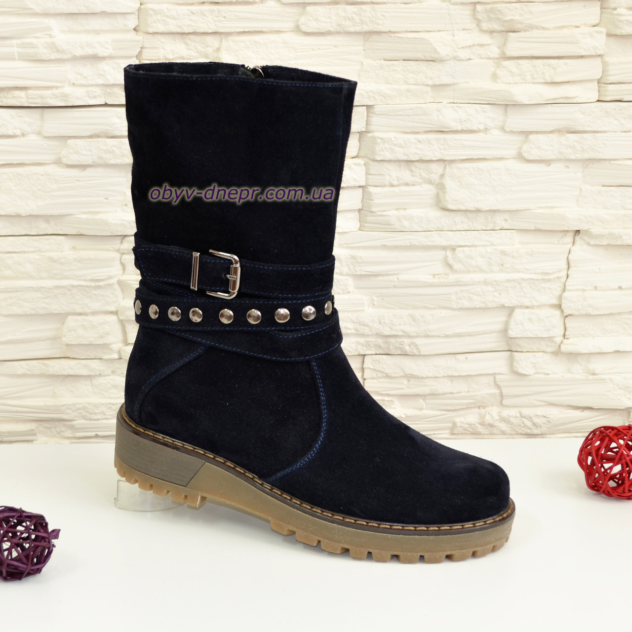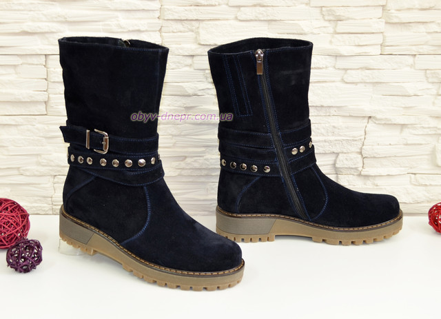 Замшеві черевики на товстій тракторній підошві ― зручні, комфортні. Виконані з натуральної замші синього кольору, декоровані ремінцями. Розраховані на стандартну повноту ноги.