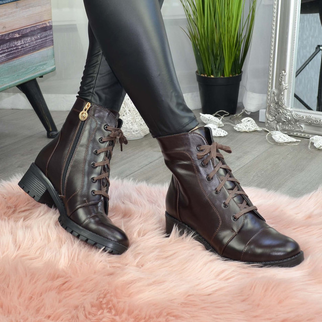 Жіночі черевики, виконані з натуральної шкіри коричневого кольору. Модель пошита в класичному стилі. Зручні та стильні, акуратні і комфортні ― ніжка в такому взутті не втомиться. Завдяки шнурівці підійдуть на ніжку з підйомом. Для зручності одягання передбачена блискавка. Підошва лита. Розраховані на стандартну повноту ноги.