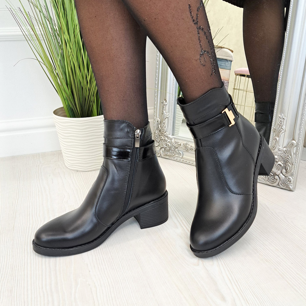 Черевики жіночі на стійкому каблуці, натуральна чорна шкіра