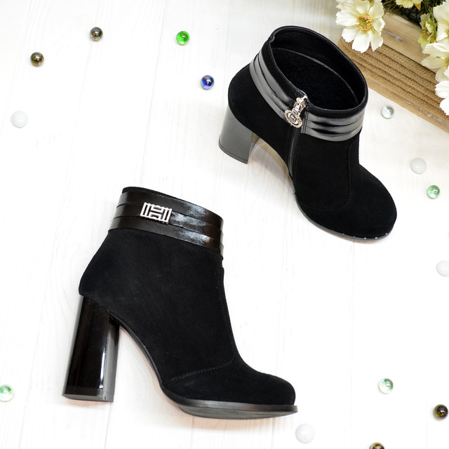 Жіночі черевики на високому стійкому каблуці. Виконані з натуральної замші чорного кольору. Декоровані лаковими ремінцями і фурнітурою. Каблук ― блок. Розраховані на вузьку і середню повноту ноги .
