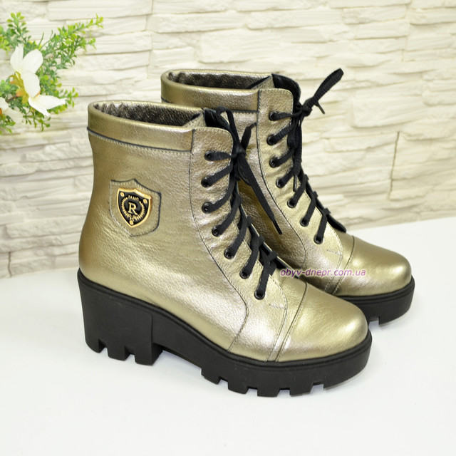 Жіночі шкіряні черевики на товстій підошві, стильні і модні ― підкреслять Вашу індивідуальність. Виконані з натуральної шкіри флотар бронзового кольору. Розраховані на стандартну повноту ноги. Повномірні, відповідають стандартній розмірній сітці.