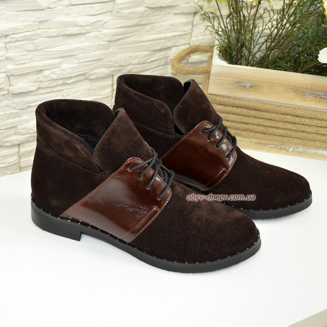 Женские ботинки на невысоком каблуке ― очень удобные, ножке в них комфортно. Выполнены из натуральной замши и кожи коричневого цвета. Рассчитаны на стандартную полноту ноги. Благодаря шнуровке - подойдут на ножку с подъемом.