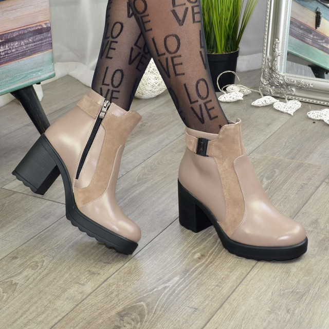 Черевики жіночі шкіряні на стійкому каблуці, колір візон/беж