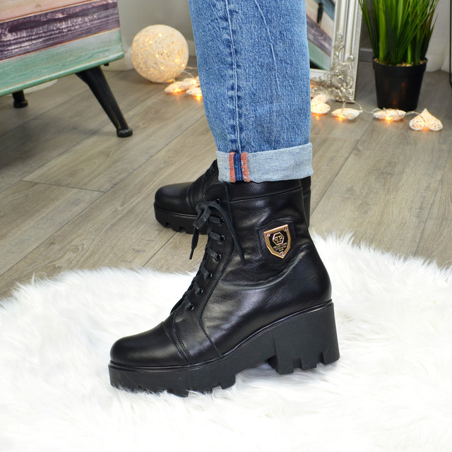 Жіночі шкіряні черевики на товстій підошві, стильні і модні ― підкреслять Вашу індивідуальність. Виконані з натуральної шкіри чорного кольору. Розраховані на стандартну повноту ноги. Повномірні, відповідають стандартній розмірній сітці.