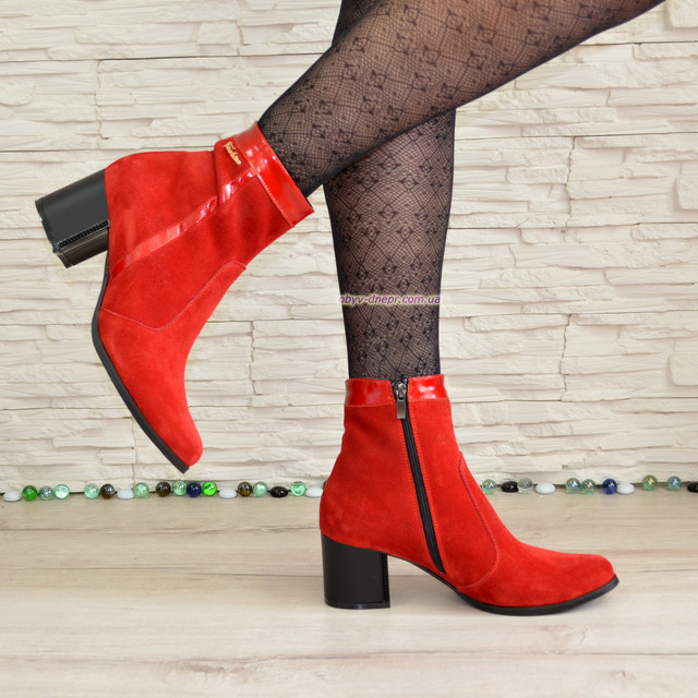 Черевики жіночі на невисоких підборах, натуральна замша і лак червоного кольору