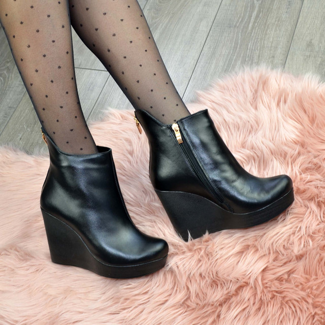 Ботинки женские выполнены из натуральной кожи черного цвета. Идеальная посадка на любую ногу. Модель очень удобная, несмотря на высокую платформу, стильные и красивые. Декорированы молнией. Рассчитаны на стандартную полноту ноги.