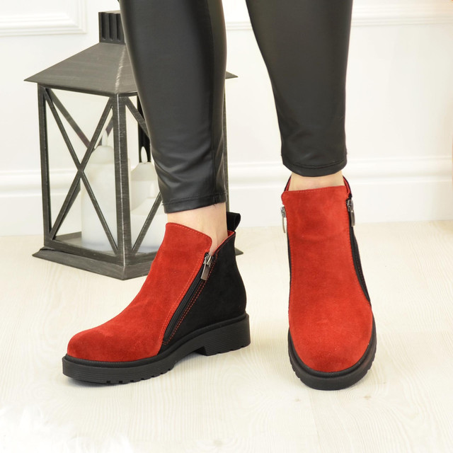 Жіночі замшеві черевики на маленькому підборах, стильні і модні ― підкреслять Вашу індивідуальність. Виконані з натуральної замші червоного і чорного кольорів. Для зручного взування з боків розташовані блискавки. Повномірні, відповідають стандартній розмірній сітці. Розраховані на стандартну повноту ноги.