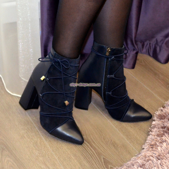 Ботинки женские на высоком устойчивом каблуке, выполнены из натуральной кожи и замши синего цвета. Декорированы резинкой. Элегантно и красиво смотрятся на ножке. Модель очень удобная, несмотря на высокий каблук, стильные и красивые. Подошва блок, каблук обтянут кожей в цвет самой модели.